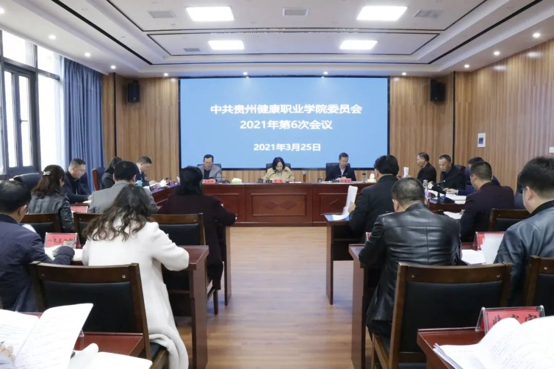 会议传达学习了全国、全省、全市两会精神及省委书记谌贻琴到铜仁调研的指示精神以及中央、省、市相关会议和文件精神。审议了《中共贵州健康职业学院委员会中心组2021年理论学习计划》《贵州健康职业学院意识形态工作问责追责办法(试行)》《贵州健康职业学院2021年思想政治工作要点》《贵州健康职业学院2021年宣传工作要点》《贵州健康职业学院党委及班子成员全面从严治党责任清单》《贵州健康职业学院2021年中医学专业(专科)申报工作方案》《贵州健康职业学院2020年度考核工作实施方案》等相关文件,并就当前工作作了相应的研究部署。