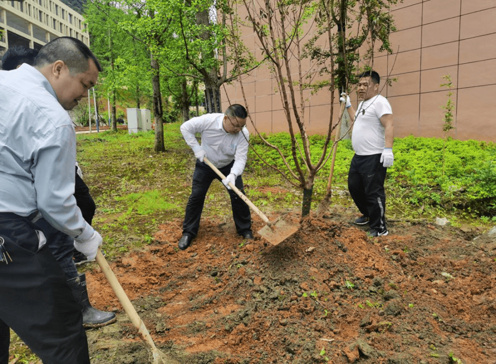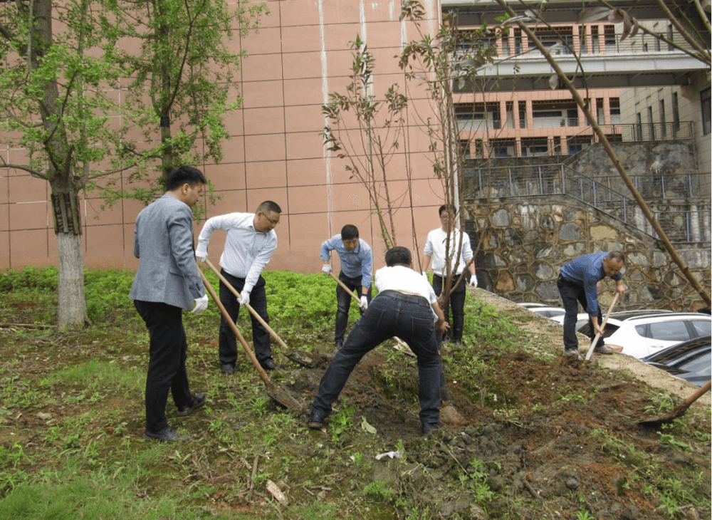 活动中,支部党员干部、群众代表10余人团结协作、互相配合,或搬运树苗、或挥锹铲土、或扶苗填坑、或培土踩实……个个热情高涨、吆吆喝喝、干劲十足。一株株新绿不断地迎风挺立。历时40余分钟,培植红叶碧桃苗木5株,树高近4米,共新增校园绿化覆盖面积60余平方米。