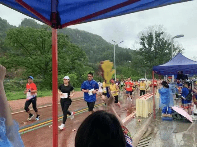 比赛当天凌晨四点,志愿者有序集合,大家齐心协力、分工明确,快速有序完成物资清点,补给物品摆放,为选手提供赛场赛道指引、成绩统计、饮水食品补给等服务。