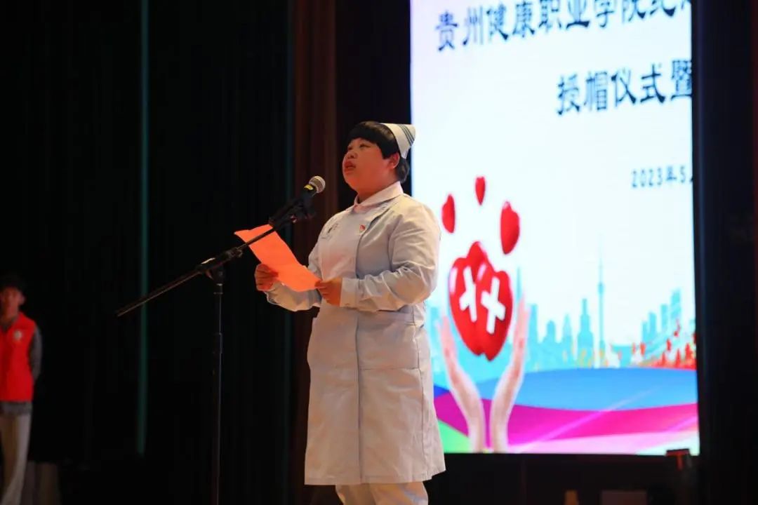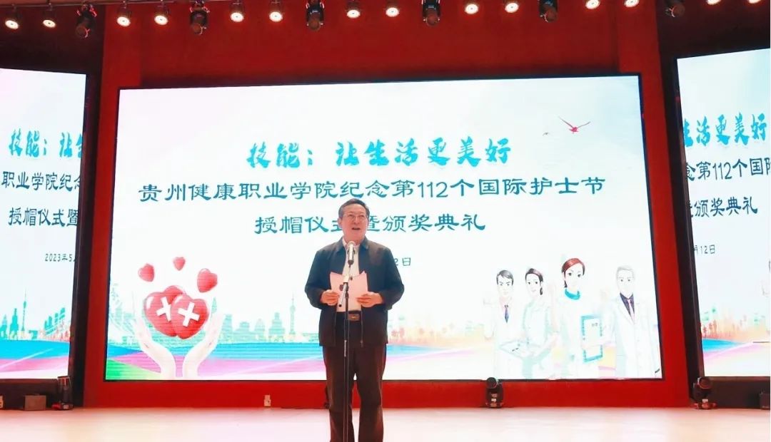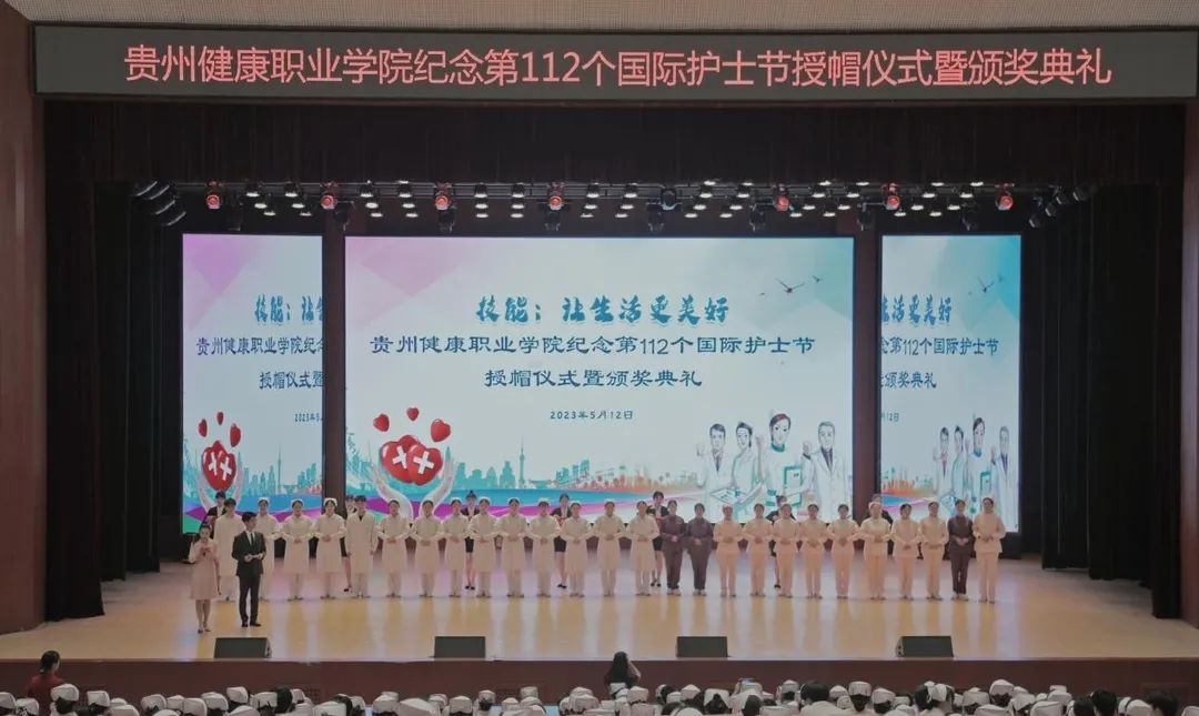云霞开锦绣,万物启芳华,在鲜花绽放、充满希望的五月,正值职业教育活动周之际,为深入贯彻落实习近平总书记关于职业教育的重要指示精神,同时激励广大护理人员继承和发扬“燃烧自己,照亮别人”的人道主义精神,护理系于5月12日在学院大礼堂隆重举行第112个国际护士节授帽仪式暨颁奖典礼活动。学院党委副书记李黔军,副院长龙宪碧,党委委员、副院长黄国刚,党委委员、护理系主任刘艳以及职能部门相关负责人出席活动。铜仁市人民医院护理部主任杨胜琴、副主任徐英,铜仁市第二人民医院护理部主任金燕,铜仁市中医医院护士长陈会,万山区人民医院护理部主任龚永珍等特邀嘉宾出席活动。