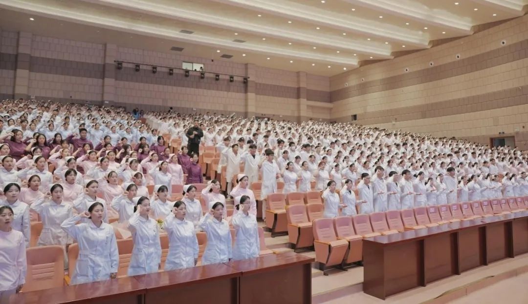 护生们虔诚地接受授帽,洁白燕帽,炙热医心,承托着前辈的期望,承托着救死扶伤的使命,心怀一团热火,手捧一暖炙热,从前辈手中郑重地接过红烛,从此“除人类之病痛,铸健康之完美”的使命镌刻心间。在老师的带领下,肃然站立,庄严宣誓,一句句掷地有声,坚决铿锵的誓言久久回荡在大礼堂。