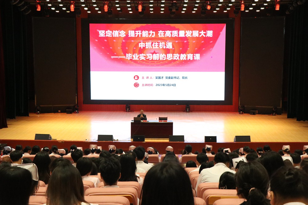 吴国才指出,213级学生马上要进入实习阶段,是踏入社会的第一步。要明确目标,抓住机遇,正确认识自身毕业课程、能力提升、阶段性发展等目标,牢固树立终身学习理念,不断提升自身能力素质。要恒定坚持,确保收获,正确认识实习实践、工作生活中遇到的困难和问题,始终坚信坚持就能胜利。要做好自己,展现风采,树立正确的职业观,以强烈的职业责任感坚守岗位,遵守规矩,争创佳绩。要克服缺点,不断提升,正确认识自身缺点和不足,保持沉着冷静的心态,积极用心观察,虚心请教,用务实的作风、扎实的业务能力破解自身难题。