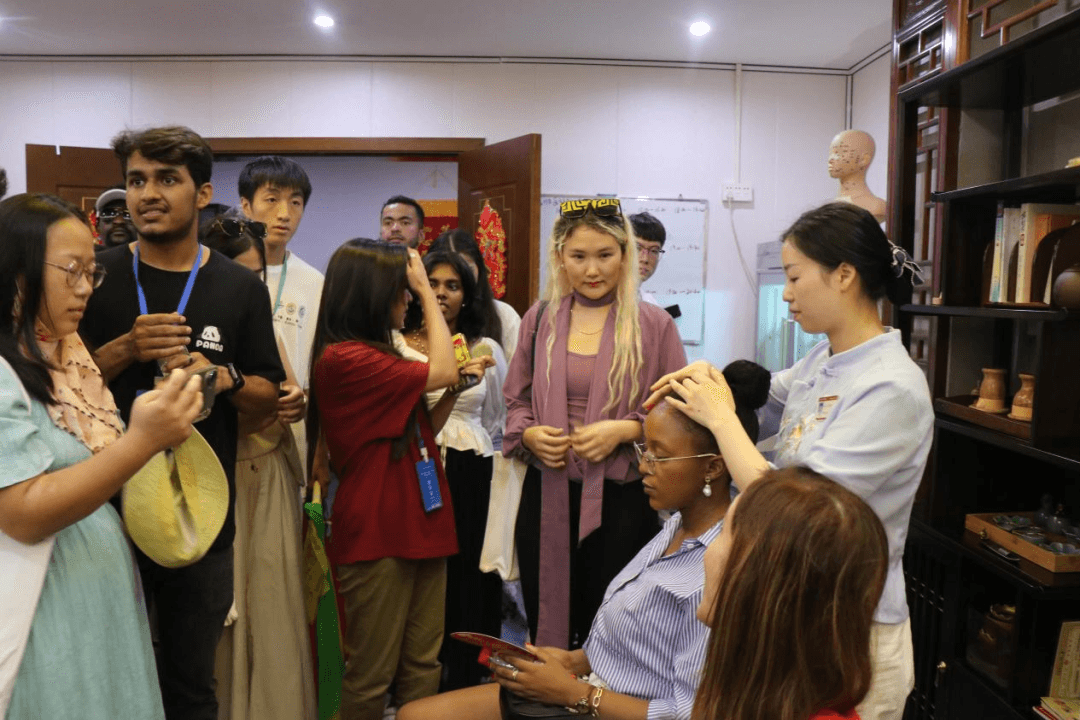 在中南门古城,国际学生们漫步在中南门的街巷中,古色古香的老式建筑与扑面而来的市井气息相结合,让大家感受了铜仁厚重的历史文化底蕴。在梵净医馆,国际学生们在讲解员的带领下参观了医馆陈列的各种中药材、中医养生挂画、中医书籍,此外,他们还体验了中医把脉、拔火罐、穴灸等,大家不时发出阵阵惊叹,对中医文化的崇敬之情油然而生。