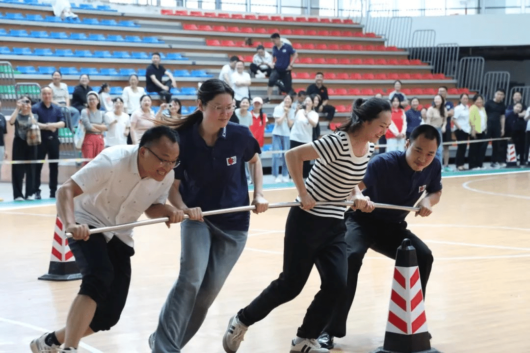 团体赛项目更是精彩纷呈。抱球接力跑中,各工会小组派出 6 人参赛,男女各 3 人,大家抱着篮球往返接力跑,团结协作,奋力拼搏。绕杆障碍跑要求 8 人一组,男女各 4 人,4 人一组握杆绕过障碍区,再换另一组 4 人完成比赛,考验了团队的默契和配合。过河搭桥项目中,大家齐心协力,用砖块搭建通道,成功到达终点。羽毛球团体赛采用混合团体赛制,包括男子双打、女子双打、混合双打、男单、女单等项目,比赛分两个阶段进行,各参赛队伍展现了高超的球技和顽强的斗志。