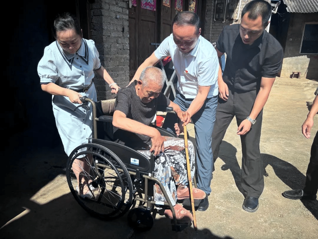 上门服务暖民心。教师党员们分组行动,携带轮椅、电子血压仪、助行器等专业器材,深入十几位村民家中,特别是高龄、行动不便的老人家庭,提供精准帮扶。康复治疗专业的老师们“手把手”指导老人正确使用辅助器具,耐心讲解注意事项;养老照护团队来到半失能老人汪绪明家赠送轮椅,为其家人耐心讲解了防褥疮、患肢康复等照护知识。