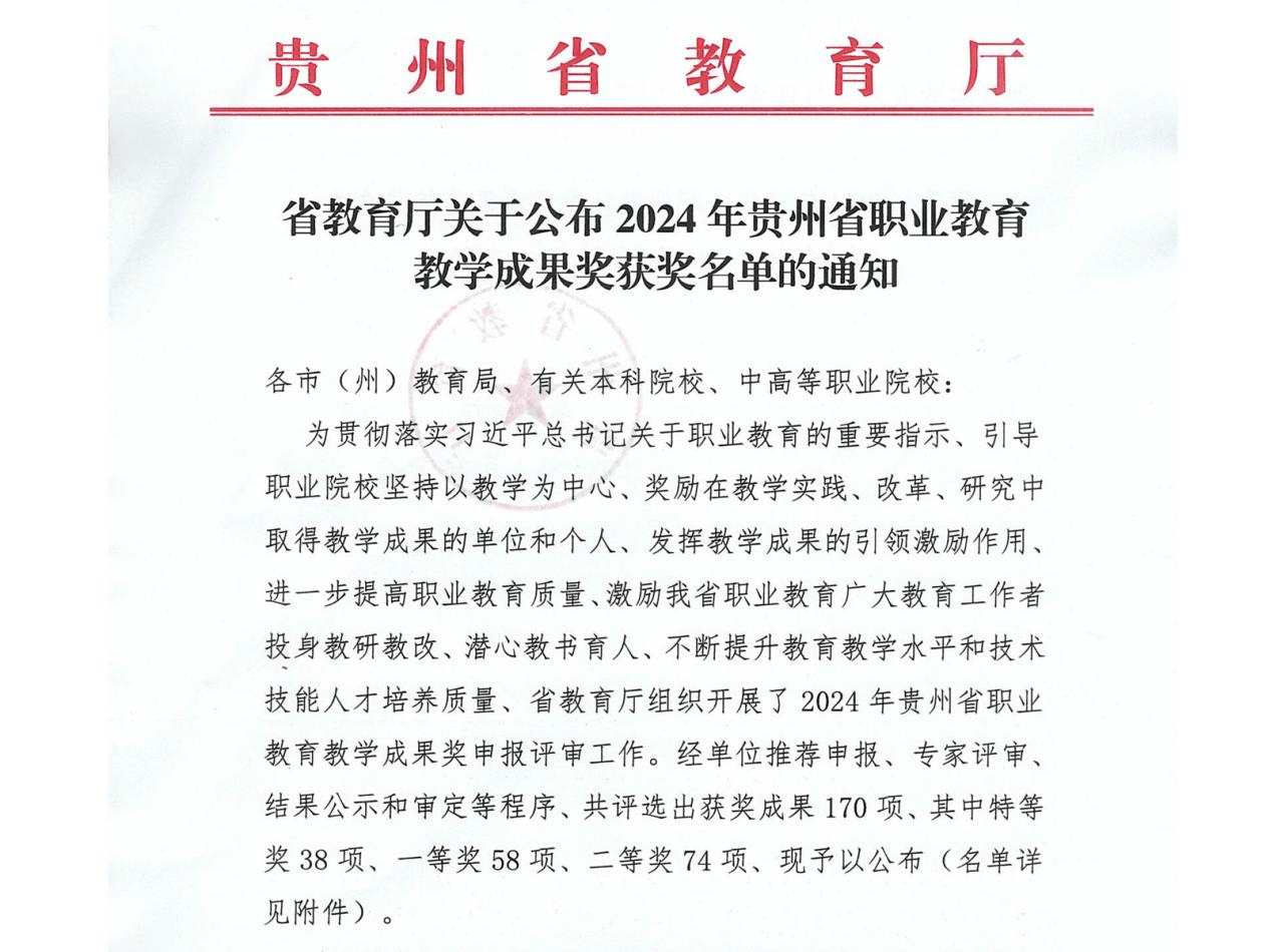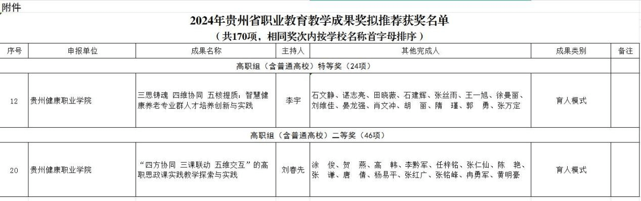 近日,贵州省教育厅公布了2024年贵州省职业教育教学成果奖获奖项目名单,我校申报的《三思铸魂 四维协同 五核提质:智慧健康养老专业群人才培养创新与实践》荣获特等奖、《“四方协同 三课联动 五维交互”的高职思政课实践教学探索与实践》荣获二等奖。