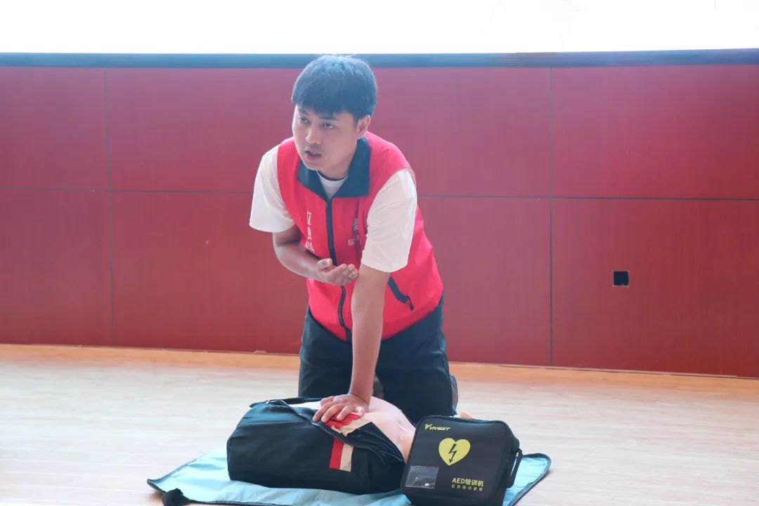 在理论讲解环节,陈浩宇以《关爱生命 救在身边》为主题,围绕心肺复苏术(CPR)、自动体外除颤仪(AED)的使用方法等核心急救技能,通过深入浅出的讲解、生动形象的案例分析,将专业知识转化为通俗易懂的内容。同时,他还进行现场演示,详细拆解每个动作的标准流程、操作要领与关键注意事项,让参训人员对急救技能有了更直观、清晰的认识。