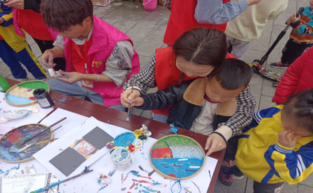 有革命歌曲熏陶,有英雄故事激励,社区的孩子们很受启发,他们的小手纷纷拿起画笔,在小簸箕内画鲜红的党旗。学院铜学社的学生们为大家详细讲解活动规则以及簸箕画的特点、技巧和注意事项。孩子们神情专注,细细描绘。有的在党旗旁画上了花草和果树,有的让党旗高高飘扬在高山云朵中,每一幅都传达出孩子们纯真美好的愿景。