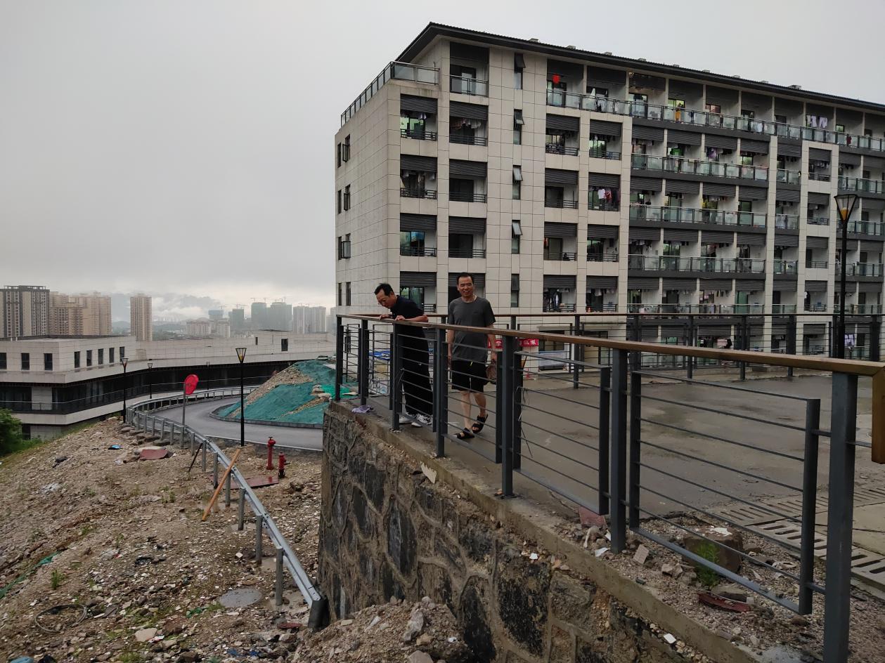 图为李黔军副书记实地查看B区学生公寓区护坡