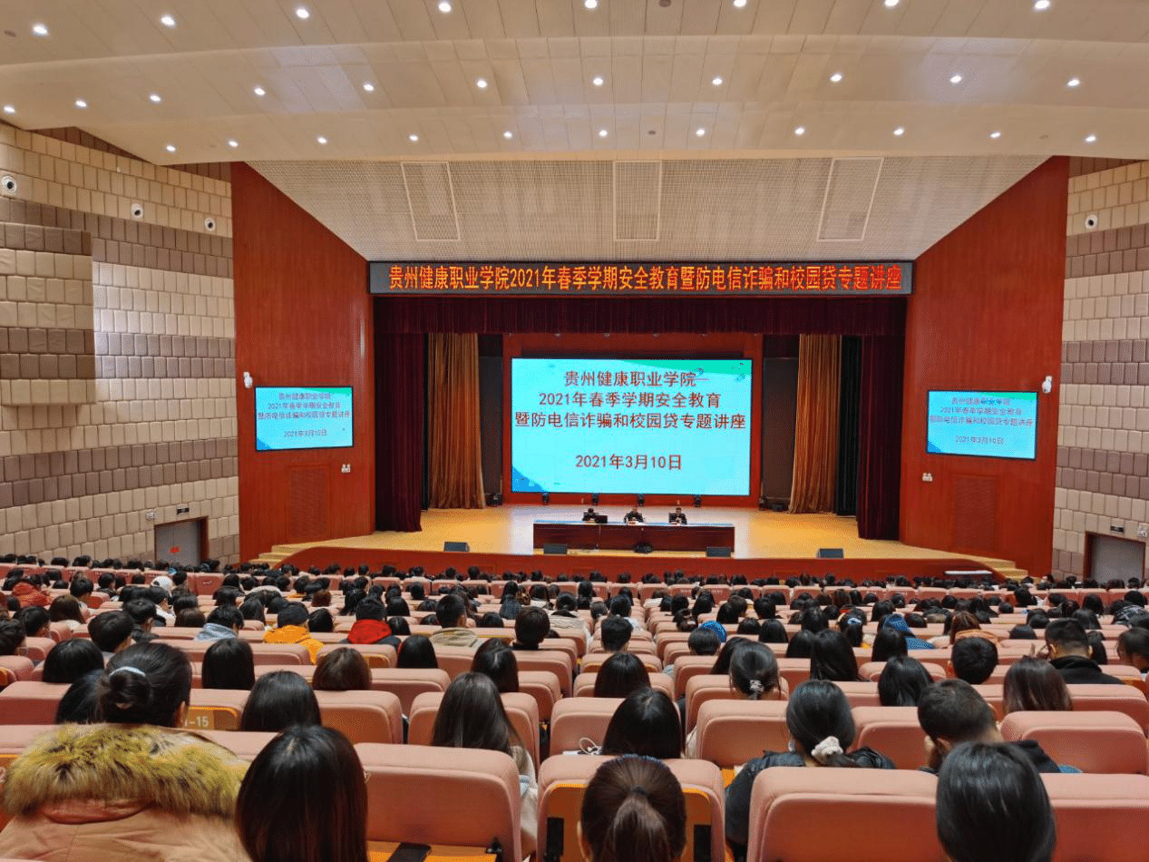 新年新气象,新学期新起点,开学伊始,为切实提高师生安全防范意识,杜绝网络诈骗和校园贷在校园发生。3月10日,保卫处、学生处联合铜仁市公安局碧江分局文昌派出所在学院大礼堂举办贵州健康职业学2021年春季学期安全教育暨防电信诈骗和校园贷专题讲座。保卫处、学生处负责人,铜仁市公安局碧江分局文昌派出所副所长陈健雄及我院全体专(兼)职辅导员、学生代表共计1000余人参加活动。