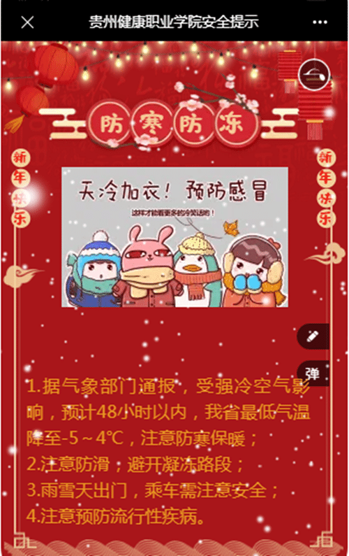 12月24日,保卫处编制下发了《安全提示》,提醒师生注意防寒防冻,同时,提前储备了工业盐、铲雪锹、雨靴、警戒提示标识标牌等应急物资。