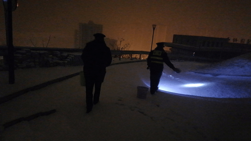 26日凌晨2时,各岗位人员进入责任区域,开始撒盐除冰工作。