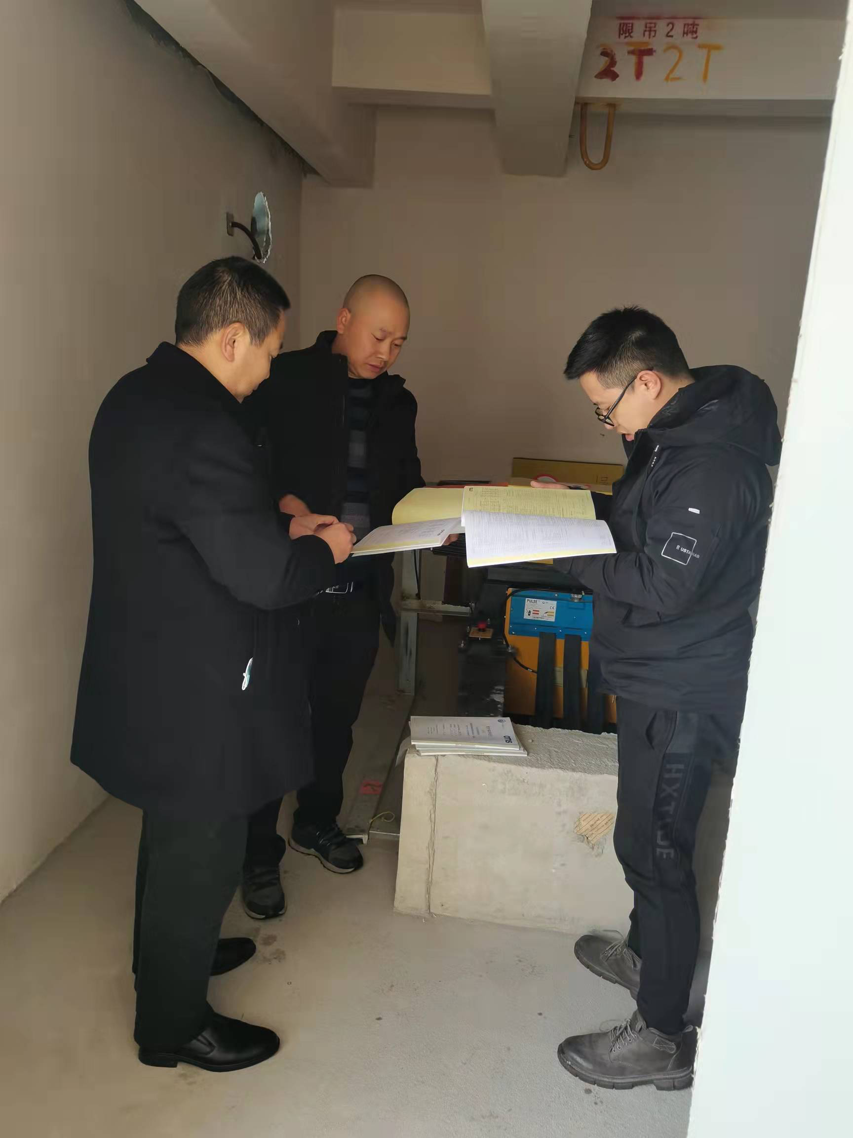 图为工作员检查电梯维保情况