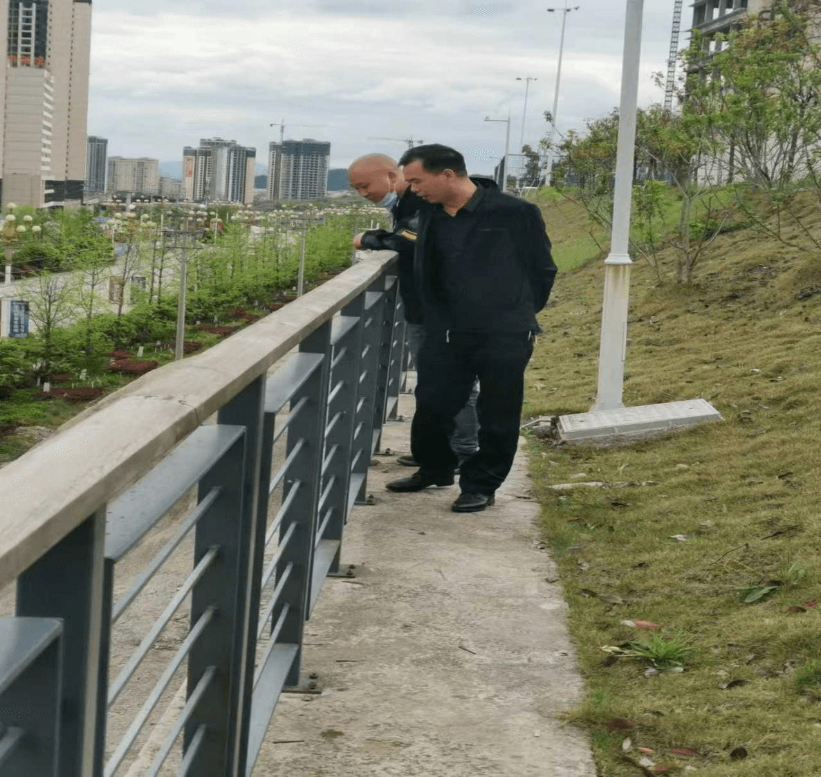 工作员对体育馆东侧高堡坎进行实时查看