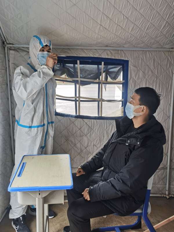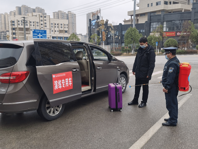 演练中,我院在南门设置场景,模拟演练返校学生进入校园的防控环节,学生在校门口保持1米距离排队,在佩戴口罩、体温检测无异常的情况下可以正常入校,对体温异常者进行留观处理或专车送往学院健康驿站就诊,对重症人员的报告、转运和送医等各项环节进行详细演练。