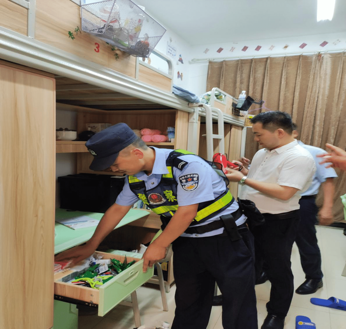 图为文昌派出所民警在学生宿舍进行管制刀具排查