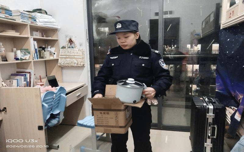 图为联合公安民警在宿舍区进行管制刀具、大功率电排查