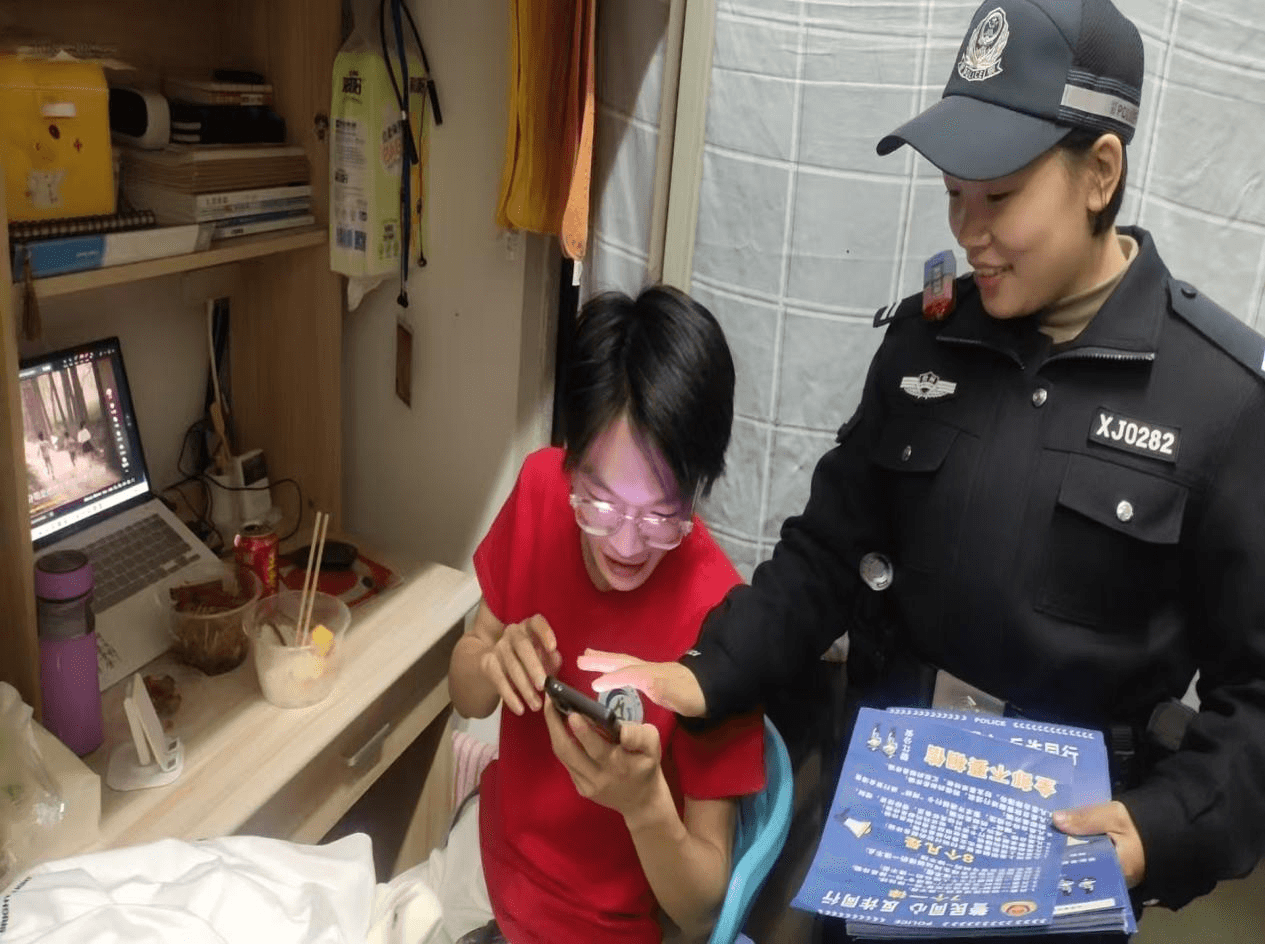 本次活动,以校园反诈防骗为主题,通过进校园、进寝室、进食堂、进教室、进班会的“五进”形式,深入校园各个区域、主要场所,全方位、无死角地对学生开展反诈宣传。以校园为阵地,在人流密集的食堂、教学楼、寝室等区域设立宣传点,制作宣传展板,发放《校园反诈指南》宣传单,宣传常见校园诈骗手段及应对措施。深入学生宿舍和教室,在每栋楼楼梯口、寝室、教室等醒目位置张贴反诈宣传海报及警示标语,确保时刻提示。开展“敲门行动”,随机走访学生寝室,结合宣传单内容进行“一对一”反诈知识讲解,提醒学生不轻信陌生链接、不透露个人信息,并现场指导学生下载“国家反诈中心”APP。在学生主题班会上,驻校民警结合真实案例,以案说法,提醒师生不要轻信来历不明的电话、信息,不要向陌生人透露自己及家人的身份信息、存款、银行账号等情况,避免泄露个人隐私,被犯罪分子利用。
