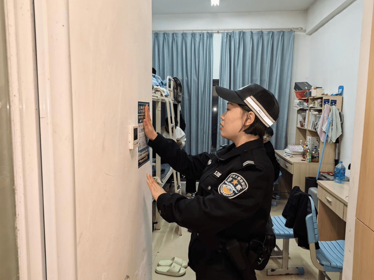 图为驻校民警在学生宿舍张贴反诈宣传海报