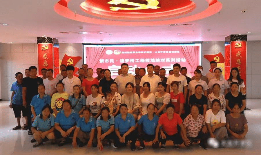 为切实做好易地扶贫搬迁安置“后半篇文章”,7月3日,护理系党总支、团总支赴大龙开展以“携手助力脱贫攻坚,同心共筑青年梦想”为主题的“新市民 追梦桥”工程校地结对暨党员服务队进社区工作,通过党建带团建,积极搭建党群连心桥,促进搬迁群众增强内生动力,助力开发区引领农民变市民,贫穷变富裕,全面融入城市过上美好生活的努力。该项工作得到了开发区的大力支持。开发区党工委委员、组织人事部部长王开元出席,大龙街道及开发区团工委相关同志和德龙新区社区居委会干部、公益性岗位全体人员参加了相关活动。