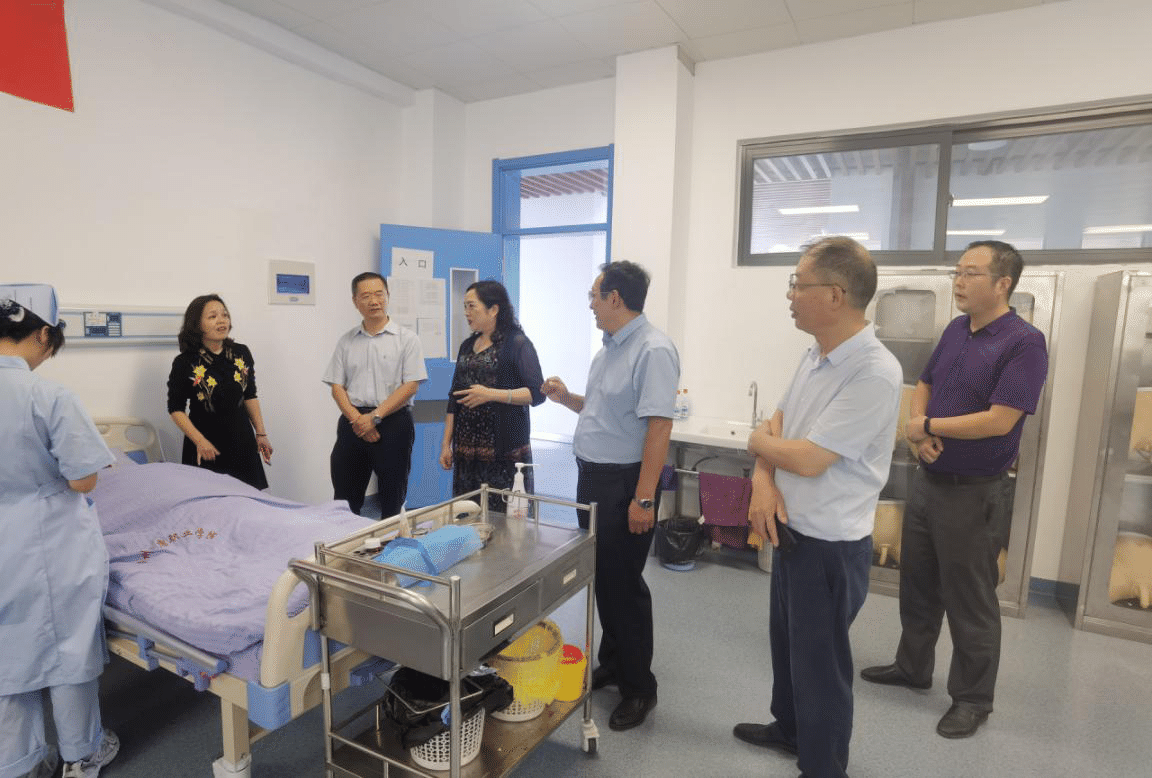 首先,护理系主任刘艳陪同领导一行来到护理系教师办公室,为大家送上教师节日祝福,勉励大家要勤奋工作,认真履行好人民教师教书育人,立德树人的本职。随后,领导一行参观了护理系实训教室,观看学生上课实训课,并嘱咐学生要认真学习,扎实掌握专业知识与实操技能,为今后进入社会工作打下坚实的基础。接着,校领导一行来到老年照护实训中心查看建设情况,刘艳介绍到护理系老年照护实训中心正在积极建设中,在未来的日子里将会服务于我们的老年护理及老年服务与管理等专业。