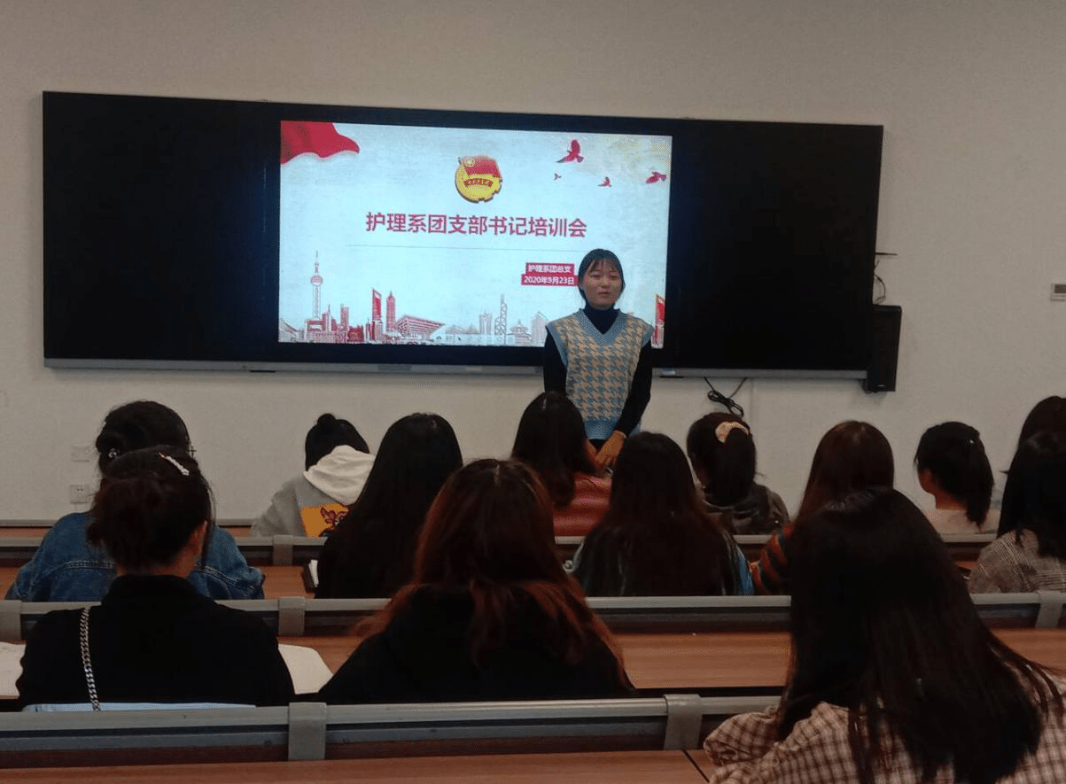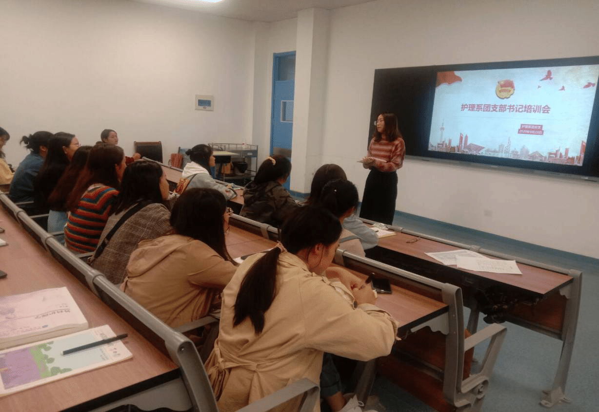 9月23日下午,护理系团总支在实训楼510教室召开了护理系团支部书记培训会,团总支陈黎媛老师出席此次会议,193级全体团支部书记参加,本次会议由团总支组织部长杨飞琼主持。