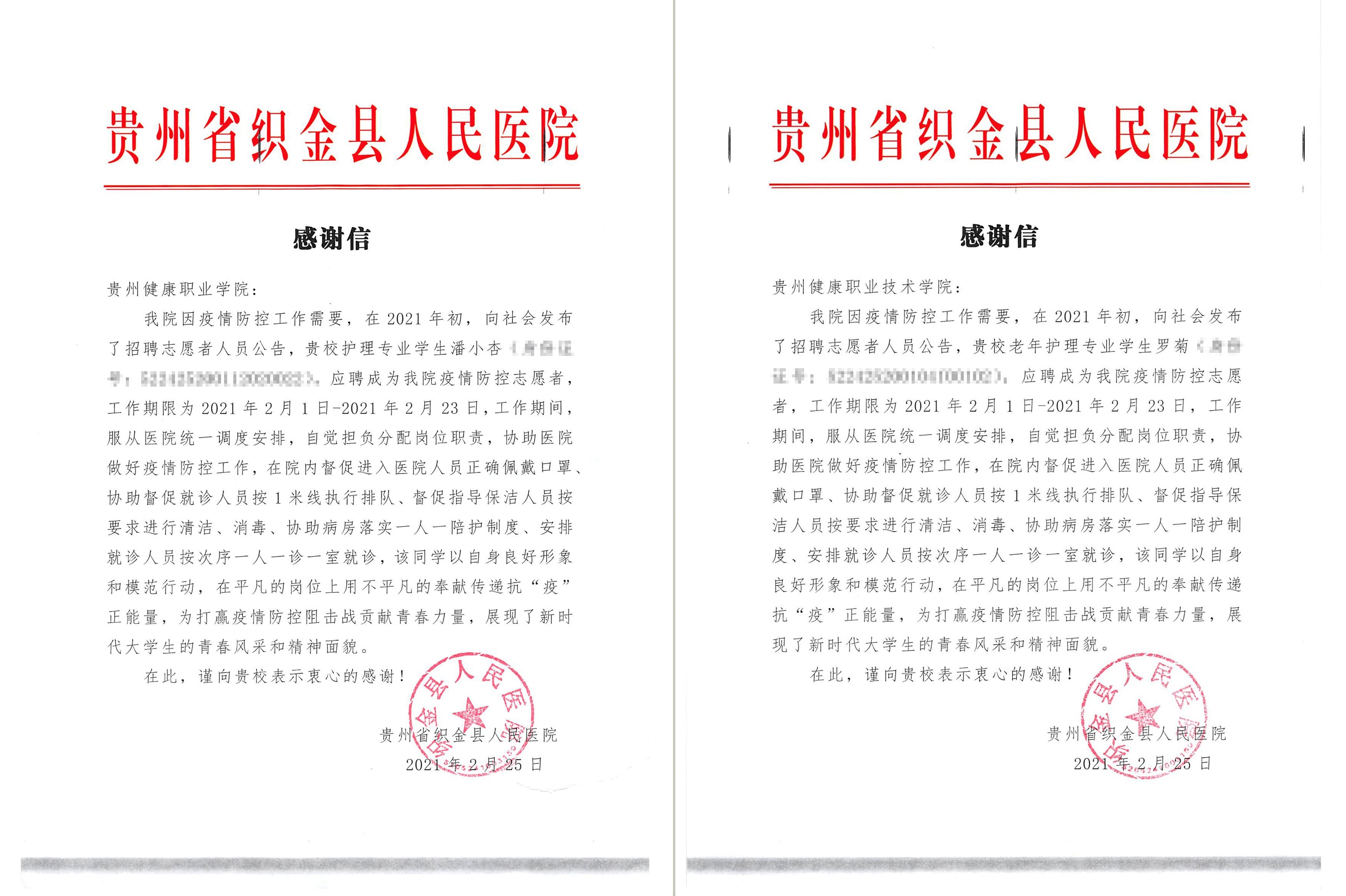 3月2日,贵州健康职业学院护理系收到了来自贵州省织金县人民医院的两封感谢信。我院护理系203级护理19班潘小杏与203级老年护理8班罗菊2名同学在春节期间,主动投身到疫情防控志愿服务活动中,始终坚守在防疫第一线,彰显了当代大学生勇于担当,不畏艰险的青春风采,获得织金县人民医院的高度肯定。