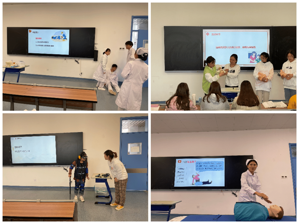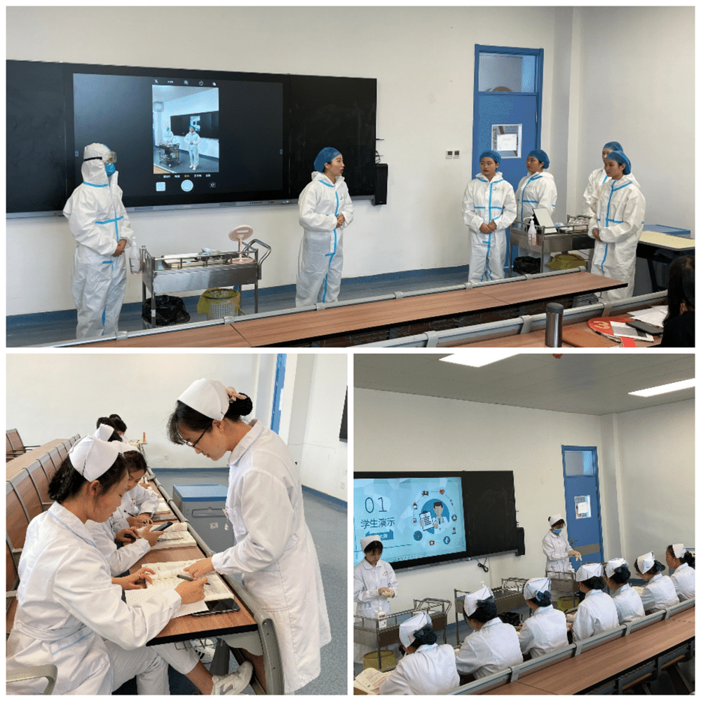 基础护理学课程组老师给我们展示了疫情防控下,感染发生的条件及作为医务人员的我们该如何进行防护,戴脱无菌手套和N95口罩及护目镜的佩戴。课堂中参赛老师不仅注重专业知识的传授,同时也关注德育教育,将“立德树人”的理念贯穿始终;老年社会工作课程组向大家介绍了理性情绪治疗模式,让我们走进老年人、了解老年人的生活模式;妇产科护理课程组结合动画和教师展示生动形象地向我们解读了胎儿分娩的过程;外科护理课程组的“窈窕伤口,菌子好逑”,破伤风的处理原则,也让我们记忆犹新;急危重症护理学的老师向我们讲解关于中暑病人的护理,如何做到“防在前,救在后”的核心理念,同时教会了我们心肺复苏的黄金“4”分钟的“4”问处理方法,教会大家学会黄金4分钟,为守护生命保驾护航。