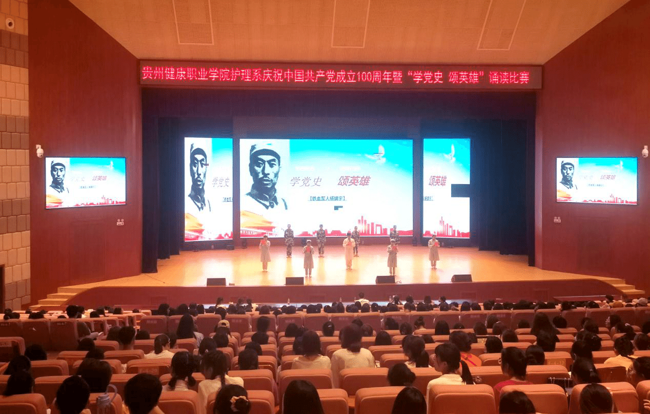 为庆祝中国共产党成立100周年,深入推进党史学习教育,进一步加强对广大师生的思想政治引导,增强爱党爱国情怀,贵州健康职业学院护理系于2021年5月14日19点在学院大礼堂举办“庆祝建党百年活动暨‘学党史、颂英雄’诵读比赛”。护理系副主任黄文沛出席,护理系教师及800余学生代表参加。