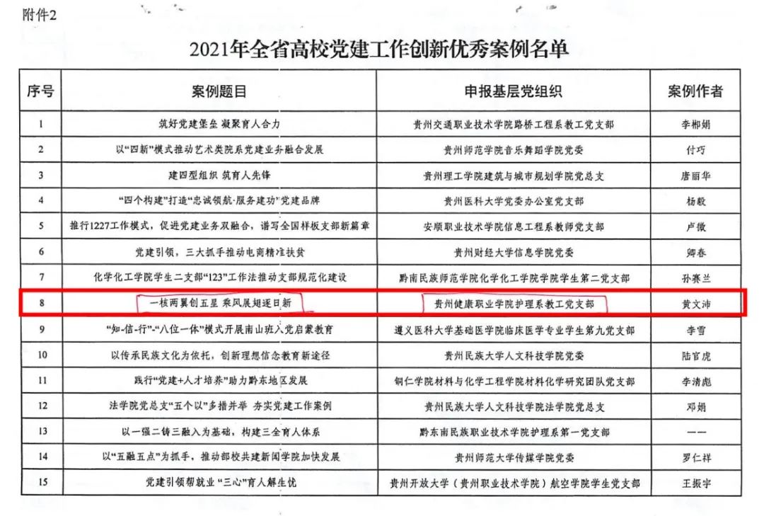 近日,中共贵州省委教育工委印发了《省委教育工委关于公布2021年全省高校党建工作创新最佳案例和优秀案例名单的通知》,公布了“2021年全省高校党建工作创新最佳案例”和“2021年全省高校党建工作创新优秀案例”名单,学院院推送的护理系教工党支部案例“一核两翼创五星 乘风展翅逐日新”荣获“全省高校党建工作创新优秀案例”。