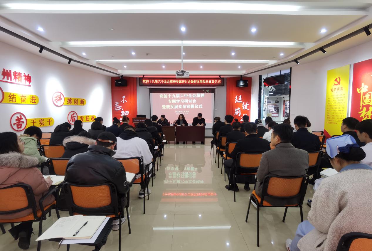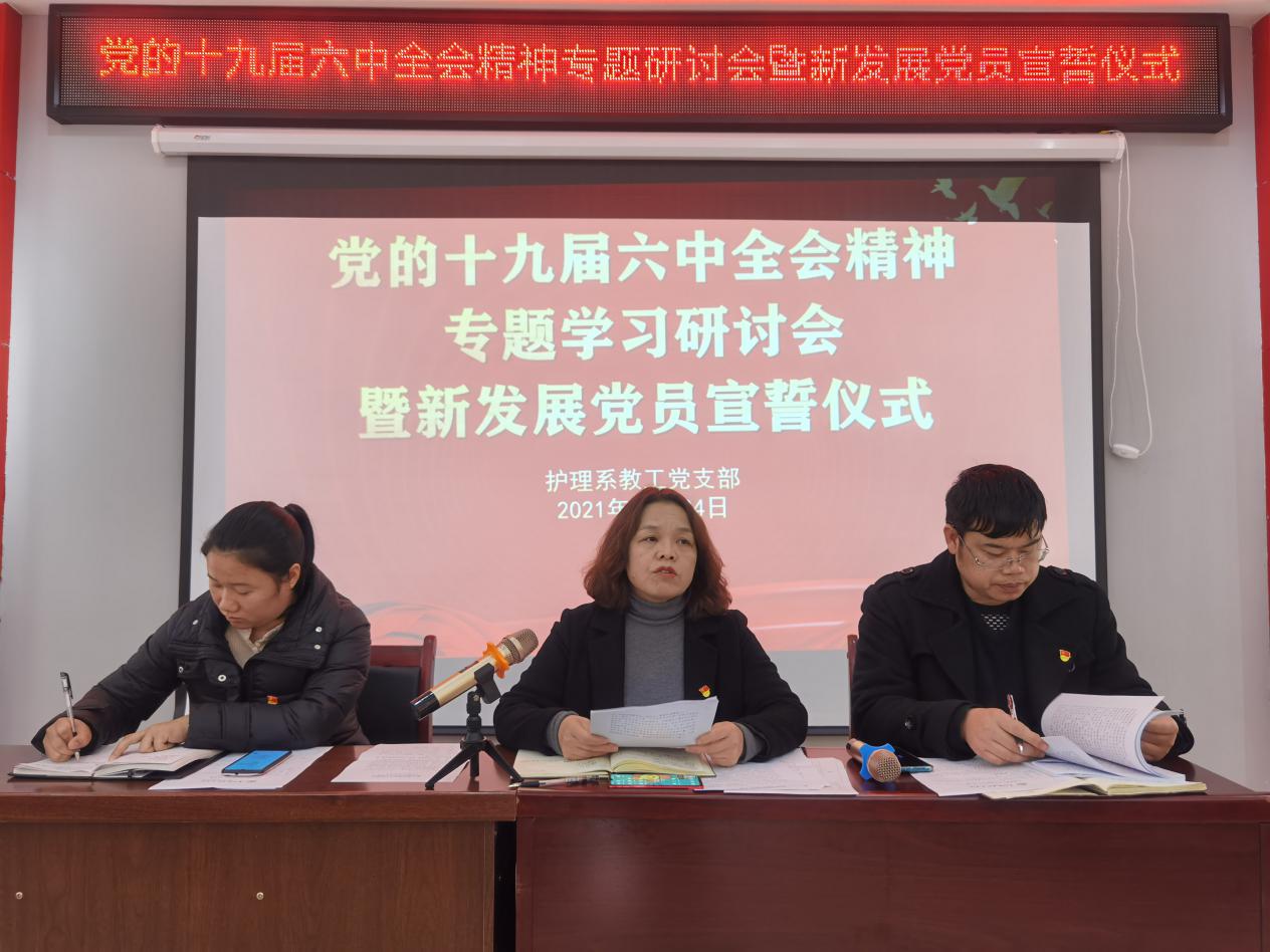 12月24日中午,在学院思想政治教育基地,护理系教工党支部召开党的十九届六中全会精神专题学习研讨会暨新发展党员宣誓仪式,全体党员、预备党员及入党积极分子参加。