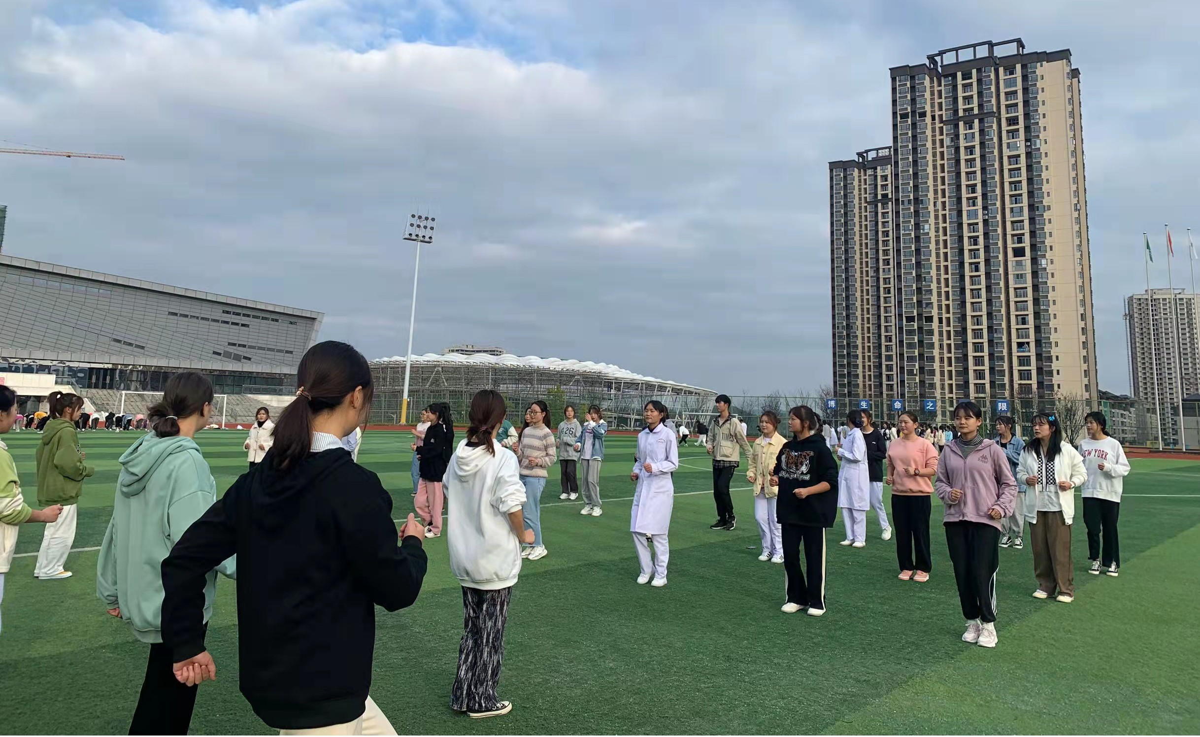 在操场上,同学们学习健美操为大学生活增添了色彩,每个关节都得到舒展。健美操不仅强身健体,还使我们从中体会到舞蹈的魅力。同学们跳完感觉心身愉快,从中收益匪浅。