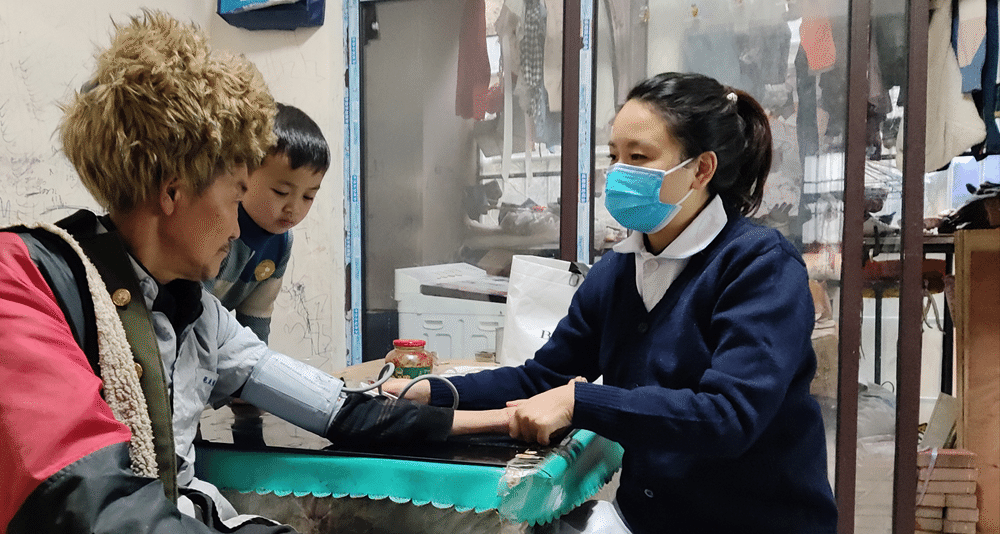 (图五:护理系党员教师张庆到结对帮扶户进行健康监测)