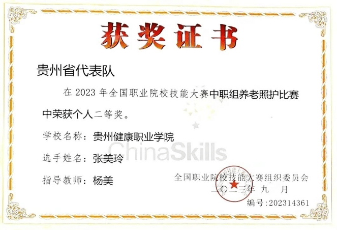 9月12日至15日,由教育部等35家部委主办的2023年全国职业院校技能大赛养老照护赛项(中职组)在云南交通运输职业学院举行,来自全国各地的56支参赛队同台竞技,我院护理系陈小红副主任带队出征,代表贵州省参赛,经过激烈角逐,护理系杨美老师指导的张美玲同学最终勇夺个人二等奖,为贵州省和我院增光添彩,可喜可贺。