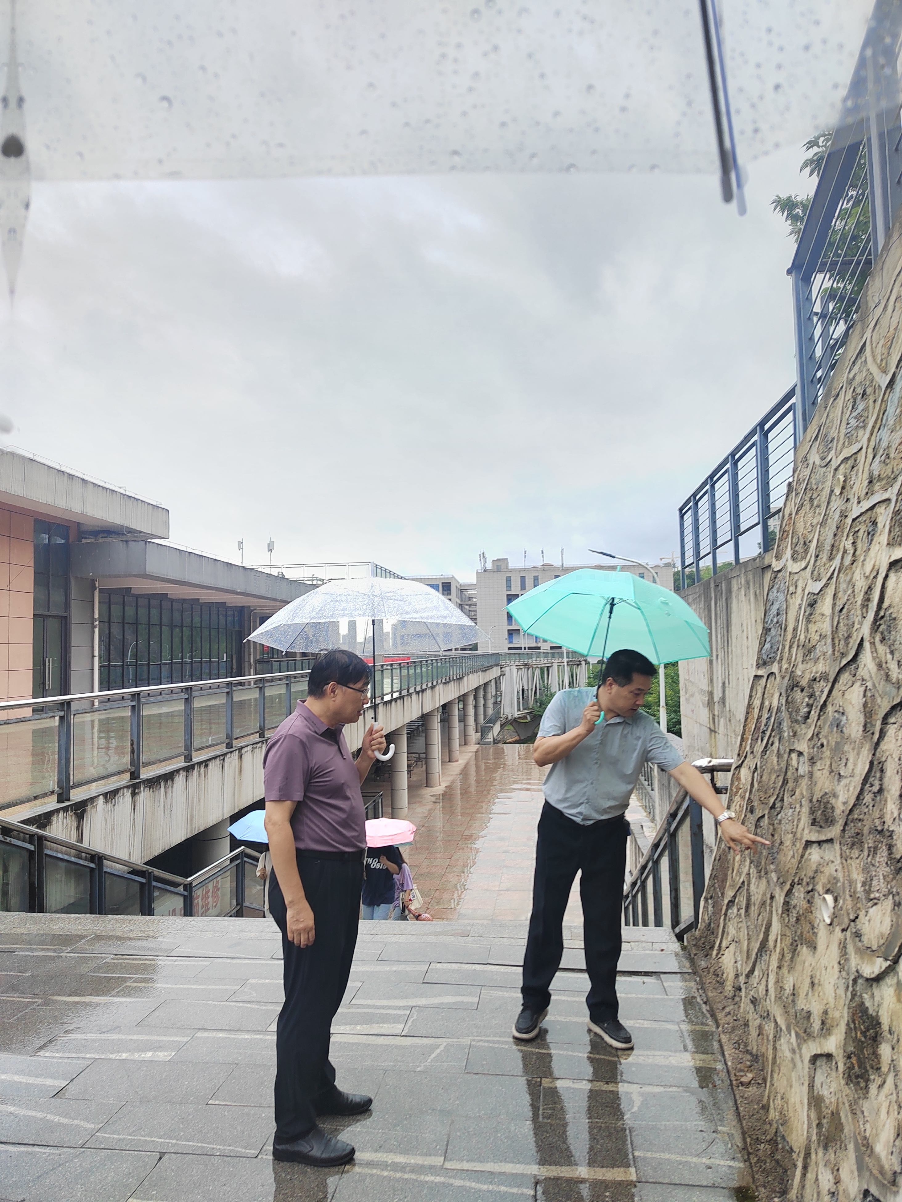 黄国刚一行重点排查了位于B7栋后方生活水箱边坡、9-345#停车场挡墙,仔细观察了边坡滑移迹象、挡土墙开裂和A7栋与早樱林间的路面塌陷、沉降区域,仔细察看了塌陷范围、裂缝深度、对临近挡墙的影响等情况。一是B7栋后方生活水箱边坡与9-345#停车场挡墙经多年多次观测,初步判定的风险等级为低,已采取的临时性监测与防范措施,与保卫处联动安排了保安日常巡查。二是A7栋与早樱林间的路面塌陷、沉降区域裂缝变大,雨水倒灌情况严重,会影响到临近挡墙的排水,存在垮塌隐患。
