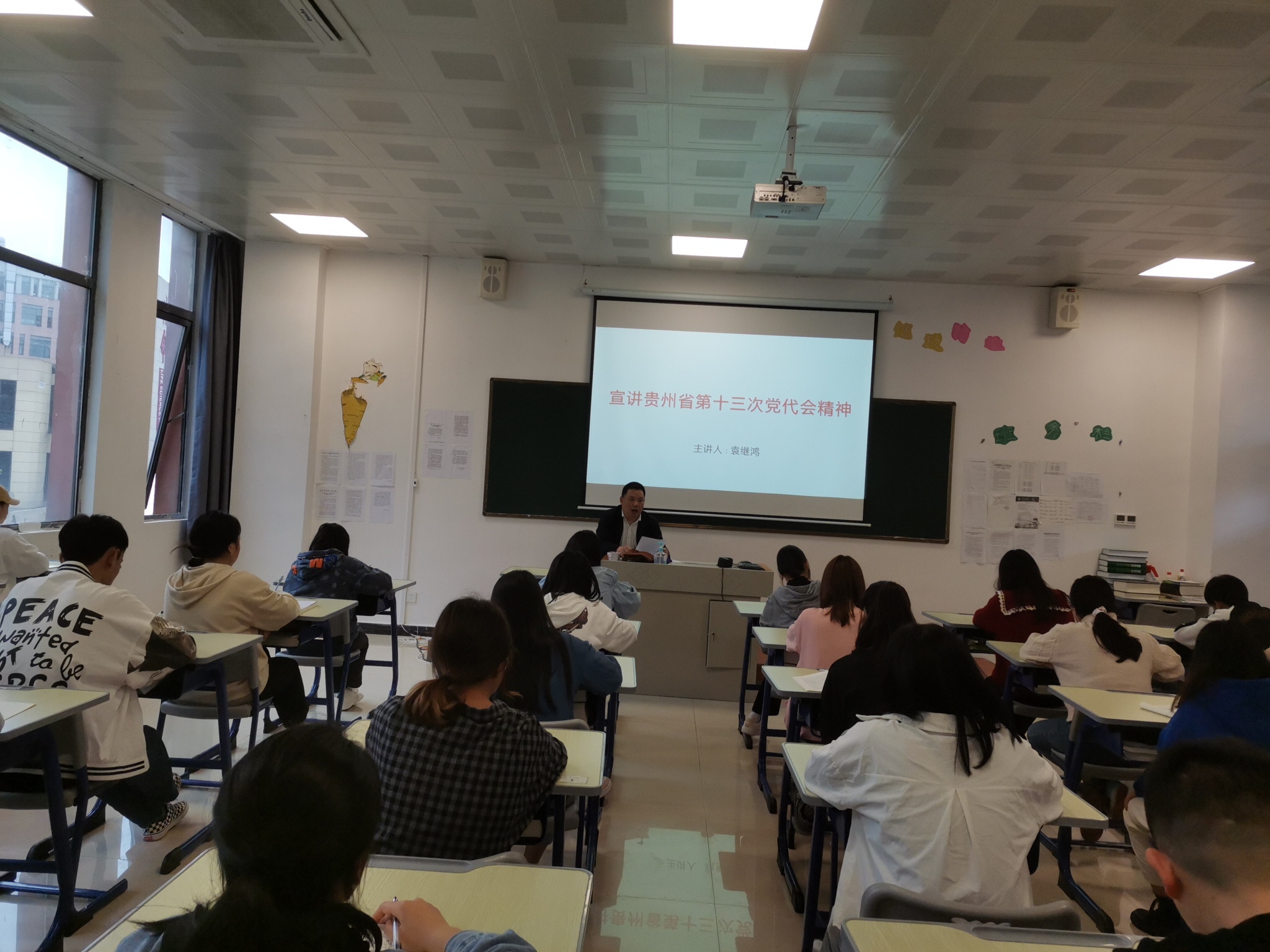 5月18日,学院党委委员、纪委书记袁继鸿深入203卫信2班,以“心怀大局 感恩奋进”为主题宣讲贵州省第十三次党代会议精神。