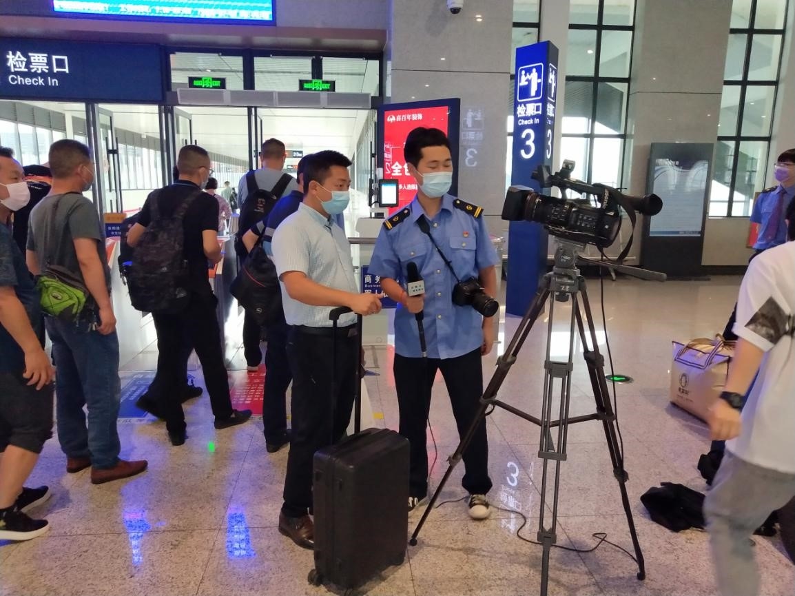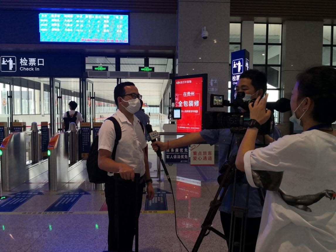 (图为7月8日李江兵老师在安顺西站借助安顺电视台开展招生宣传工作)