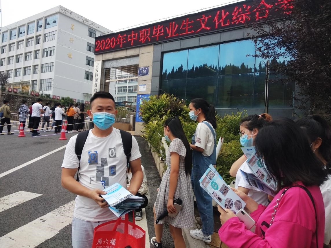 7月7日-7月9日,招生宣传组分别赴六盘水、安顺两地展开招生宣传。不同以往的是,今年受到新冠肺炎疫情影响,各校疫情防控严密,不允许进入校园宣传。招生宣传组成员发扬本苦干实干的精神,在安顺市第一高级中学、安顺市第六中学、安顺市第三高级中学、六枝特区第九中学、六盘水第四实验中学校园外和安顺职业技术学院、安顺市城市服务学校中职文化课考点外为考生及家长发放招生简章,并对我校的硬件设施、师资力量、资助政策、办学优势、校校合作、校企合作、就业前景等方面做了详细的介绍,同时向学生及家长推荐了我校微信公众号,以便进一步了解我校的招生动态和校园文化。