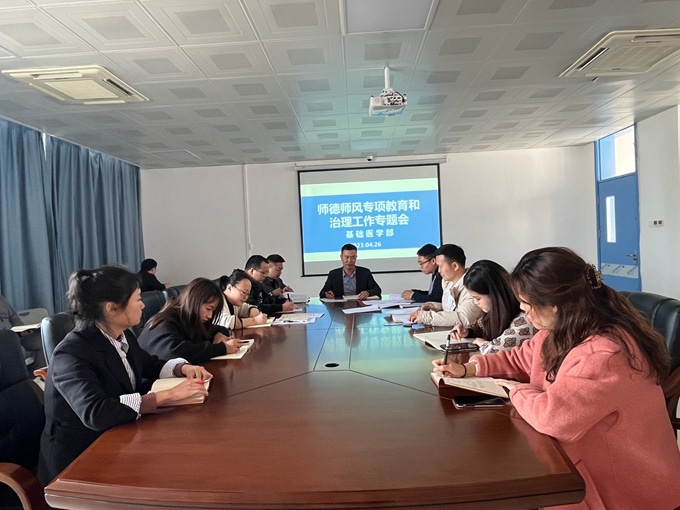 为了进一步加强师德建设,全面提高师德水平,打造一支适应学院发展需求的高素质教师队伍。根据贵州健康职业学院师德师风专项教育和治理工作方案及师德师风专项教育和治理的工作提示(三)等文件精神。基础医学部于2023年4月26日14:30在10-1-502会议室开展师德师风专项教育和治理工作专题会。