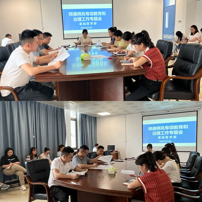 为了全面推进师德师风专项教育和治理工作,提高教师的整体素质,建设一支师德高尚、业务精良的教师队伍,根据学院相关文件要求,我部结合实际情况,精心组织,严格要求,深入开展了师德师风专项教育和治理工作。为实现育师德、正师风、树师表的工作目标,基础医学部于2023年7月5日下午14:00在10-1-502会议室召开师德师风专项教育和治理工作专题会。
