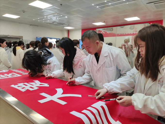 活动在肃穆的氛围中展开,师生通过观看遗体捐献者纪录片,感悟“无语良师”以身躯托举医学事业的无私大爱;随后全体默哀三分钟,以静默对话生命之重。师生以铿锵之声朗诵《生命的礼赞》,传递对奉献精神的敬意。献花仪式中,一朵朵菊花承载着感恩与承诺,被郑重放置于解剖台上。活动尾声,师生在“无言大爱,医魂永驻”横幅上签名立誓。