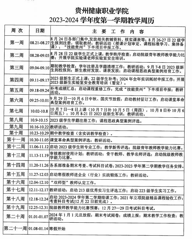 贵州健康职业学院2023-2024学年度第一学期教学周历
