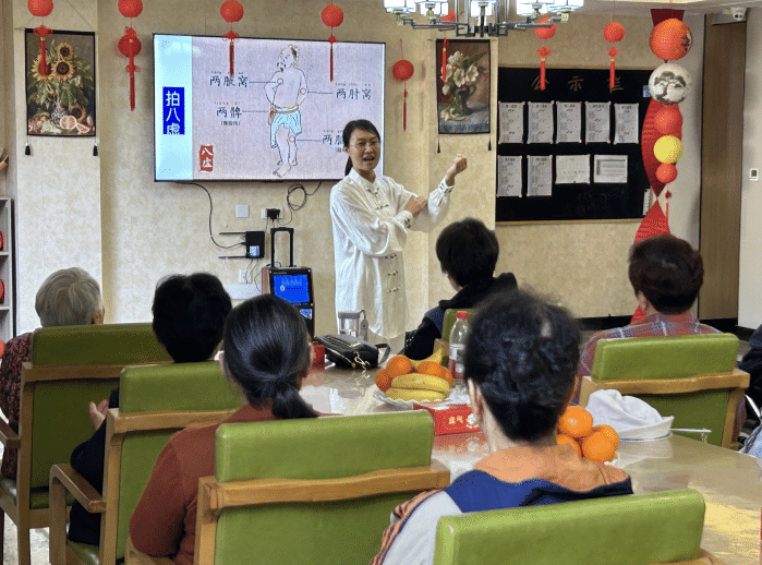 活动当天,在一片温馨的氛围里,课程组教师及全体党员为老人们组织开展了“啦啦操”“红歌演唱”“乐器演奏”等节目,让老人们跟着音乐轻轻摇晃身体跟唱,又通过“拍八虚教学”“红心闪闪手指操”“纸杯叠叠乐”等互动节目,让老人们在寓教于乐中锻炼了身心健康。