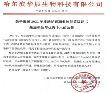 在皮肤护理职业技能等级证书培训考核工作中,我院被评为先进试点院校,健康管理系教师文佳艺被评为优秀培训师资,教师王舒被评为优秀考核工作者。