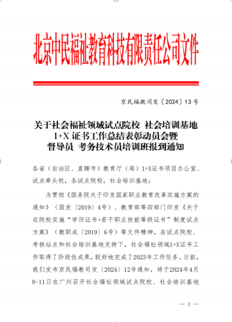 在学院领导的坚强领导和相关系部的大力支持下,我院2023年度1+X考评工作圆满完成,喜获2023年度社会福祉领域“失智老年人照护证书试点工作示范院校”、“老年康体指导证书试点工作示范院校”、“老年康体指导证书优秀试点院校”称号。