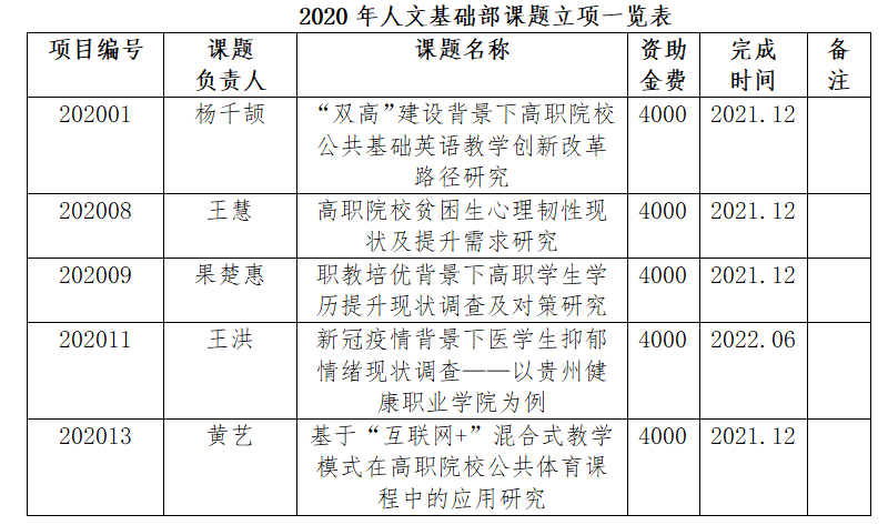 根据《贵州健康职业学院关于下达2020年度校级课题立项的通知》(贵健院〔2017〕157号),我部杨千颉、王慧、王洪、果楚惠、黄艺5位老师获得立项。