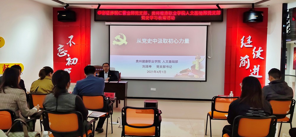 为深入贯彻落实习近平总书记在党史学习教育动员大会的重要讲话精神,扎实开展党史学习教育,进一步强化党员学史明理、学史增信、学史崇德、学史力行,4月1日下午,贵州健康职业学院人文基础部党支部联合华创证券铜仁营业部党支部共同开展党史学习教育主题活动。