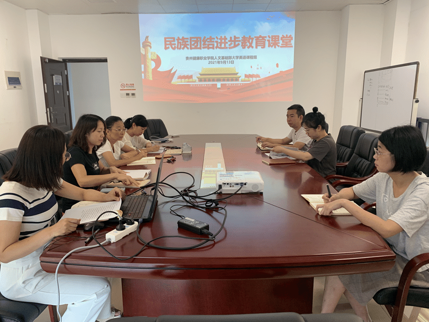 在这丹桂飘香的金秋九月,贵州健康职业学院2021级学生将于9月15日-16日报到。为了做好开学上课的准备工作,9月13日,英语教研室在科技楼708会议室召开了民族团结进步教育课堂教学讨论会。本次会议由大学英语教研组组长杨千颉主持,全体大学英语科任教师参加。