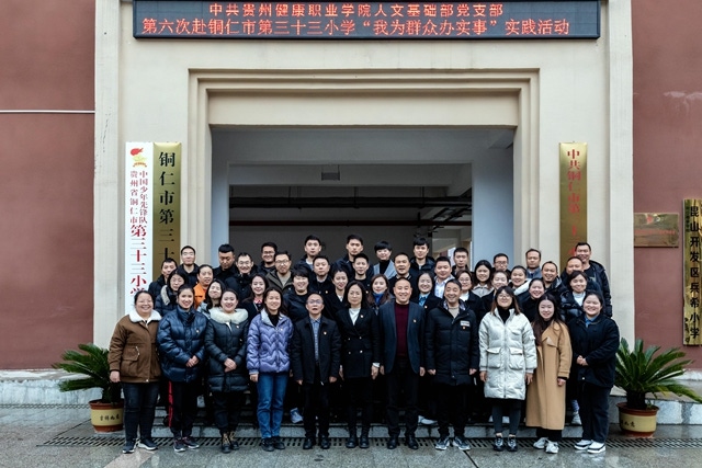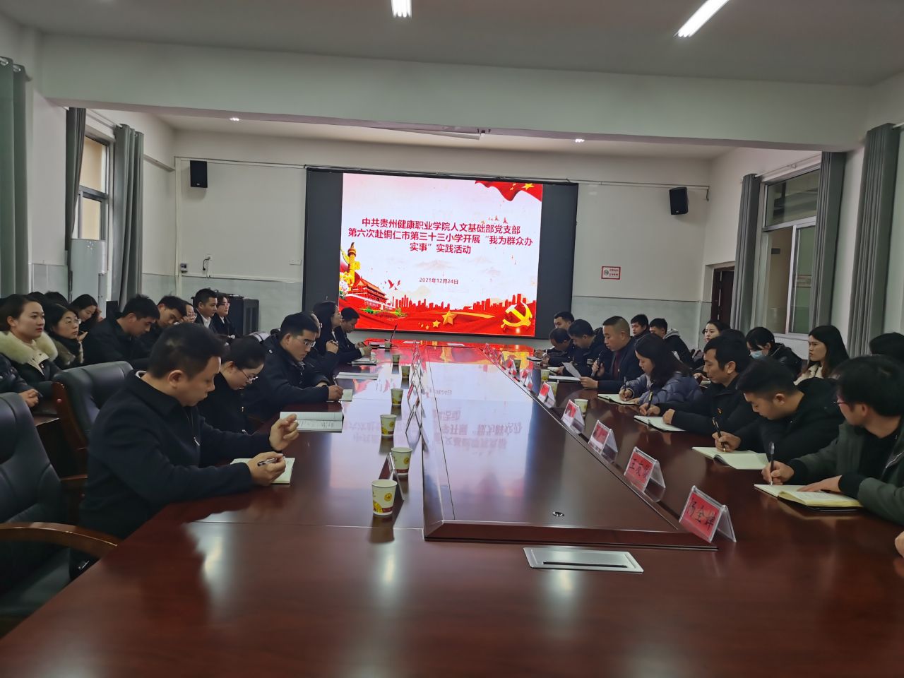 为深入推进人文基础部党支部“我为群众办实事”实践活动走深走实,助力巩固拓展脱贫攻坚成果同乡村振兴有效衔接,切实帮助提升易地扶贫搬迁安置点学校教育教学质量,2021年12月24日中午,人文基础部党支部第六次走进铜仁市第三十三小学开展我为群众办实事”实践活动,人文基础部党支部全体党员(预备党员)、教师代表,铜仁市第三十三小学全体师生,正光街道打角冲社区党支部全体党员参加了本次活动。