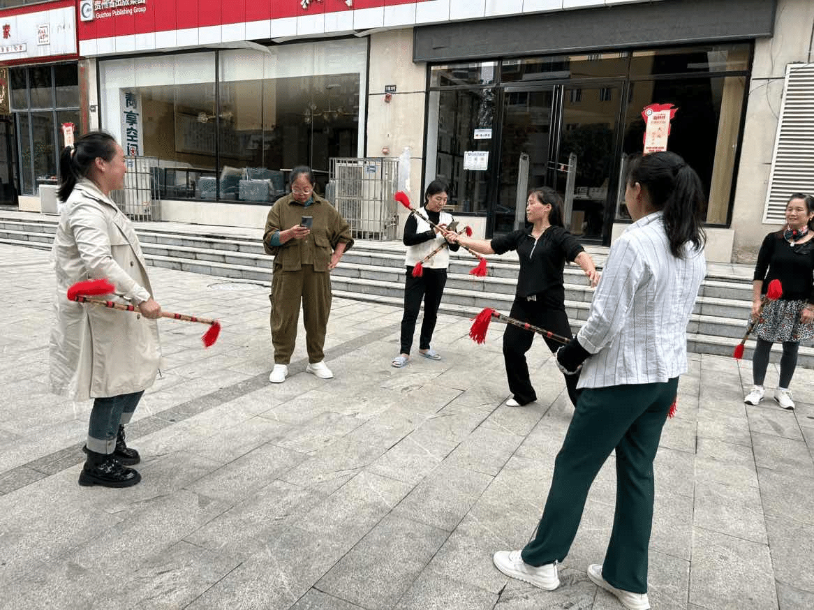 离开铜仁市第三十三小学后,人文基础部党支部联合打角冲社区党支部开展了健康政策知识宣传活动,共分发了健康政策知识宣传资料300余份,并给群众进行了详细的讲解,确保宣传政策进社区、宣传资料到手中、宣传医疗流程入脑。体育老师对打角冲社区“金钱杆”健身操团队的作品“土家莲厢”进行了排练指导。